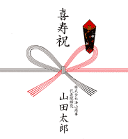 【例】 ○○株式会社 ←小さく 代表取締役 ←小さく 山田太郎 ←名前を大きく 喜寿祝 有志一同 のし紙は紅白蝶結びののし紙を使用します。