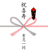 のしの表書きは”祝喜寿” ”喜寿祝” ”御祝”などです。 下に記載する名前はについては、3名程度までなら右から目上の人順に名前を書いていきます。3人以上の場合は○○一同などの呼称を使用するのが一般的です。 また、会社名など肩書が必要な場合は名前の右上に小さく記載します。