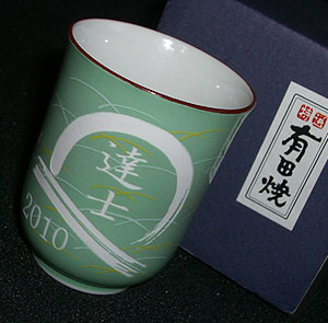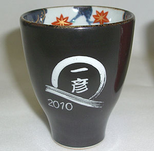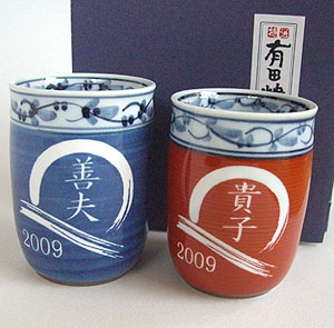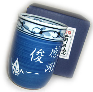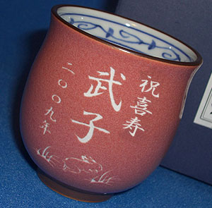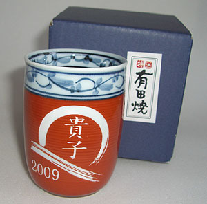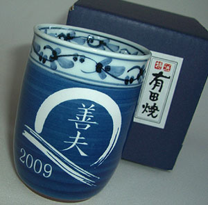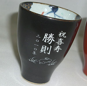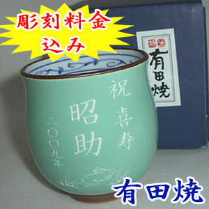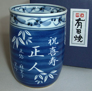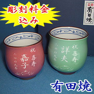 かわいらしい有田焼の湯呑で大切な方の喜寿を祝ってみませんか?選べる9つの文字入れパターンからお好きな柄を選べます。字体(フォント)の指定も可能です。